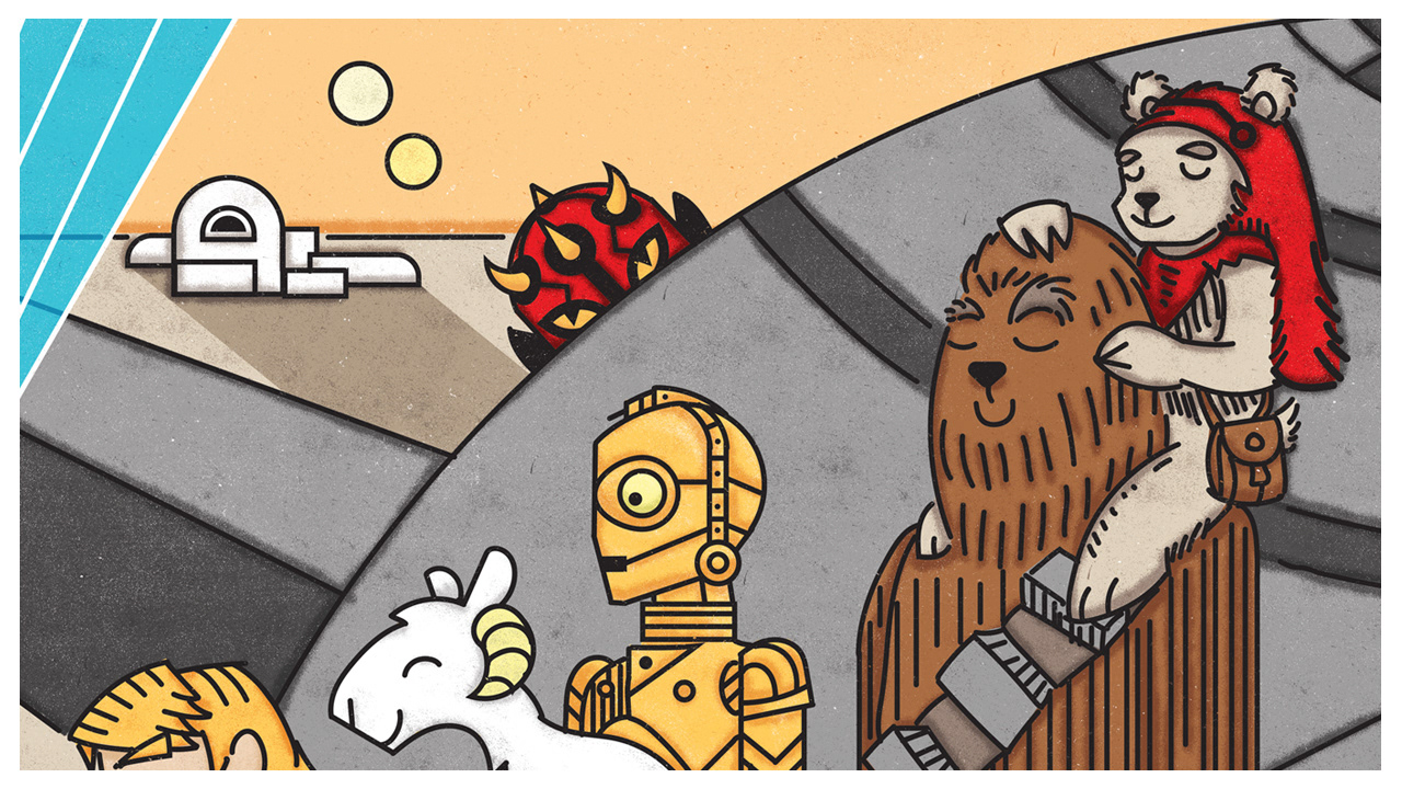 C3PO carring a baby taun taun, a Wookie and an Ewok (as the shepherds).